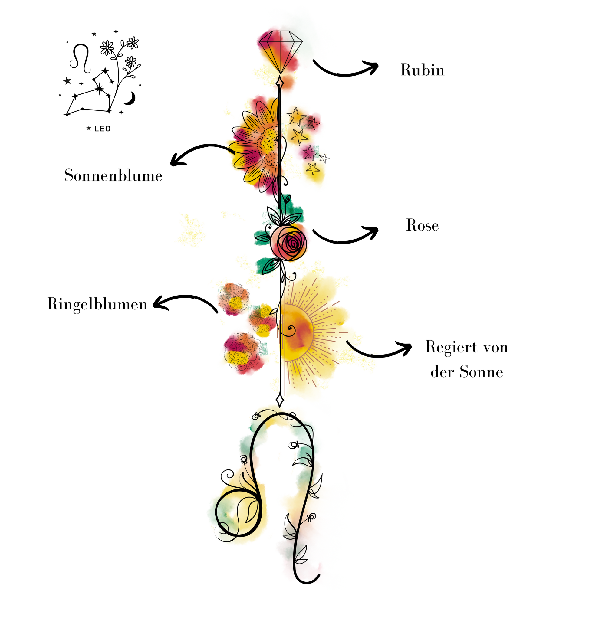 Die bewusst gewählten Farben, Symbole sowie die zugeordnete Blume und der Stein spiegeln die Essenz des Löwen wider: